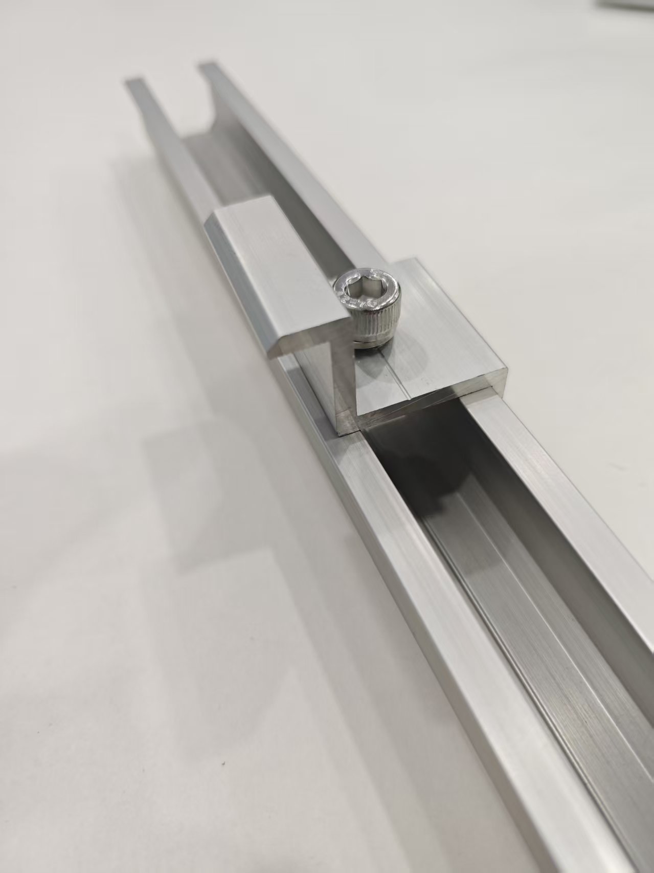 3. Ezután helyezze be a középső végbilincset és a középső bilincset a sínbe, és húzza meg a csavarokat. A folyamat során a fotovoltaikus panelt egyidejűleg kell elhelyezni.
